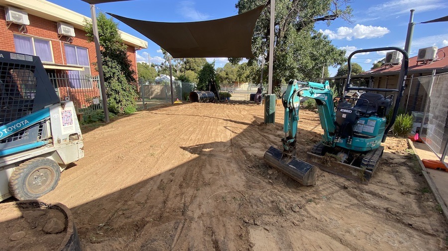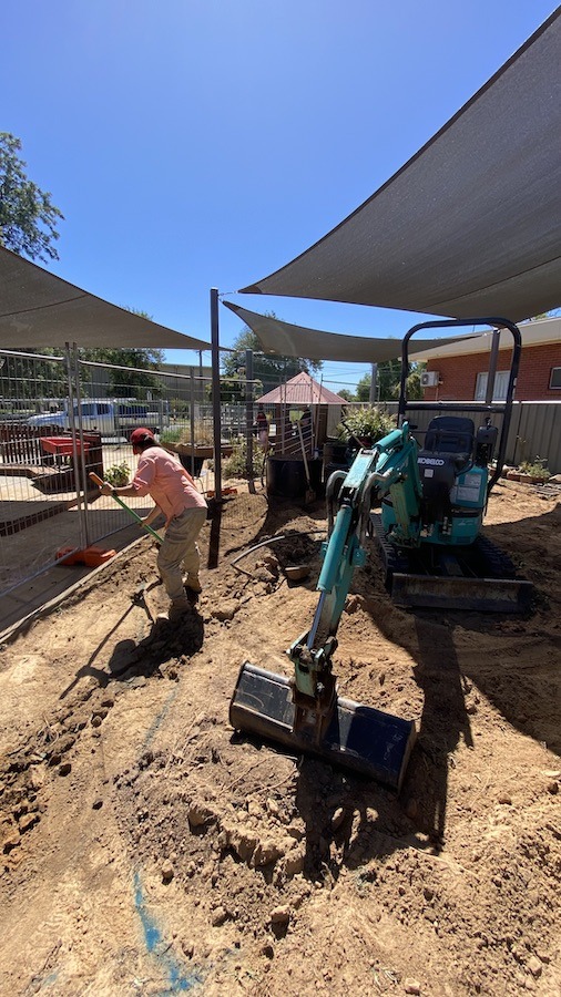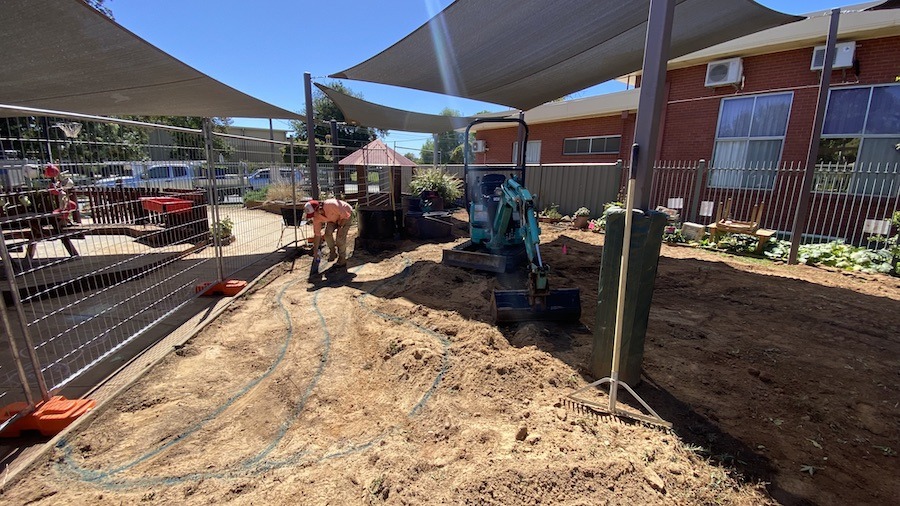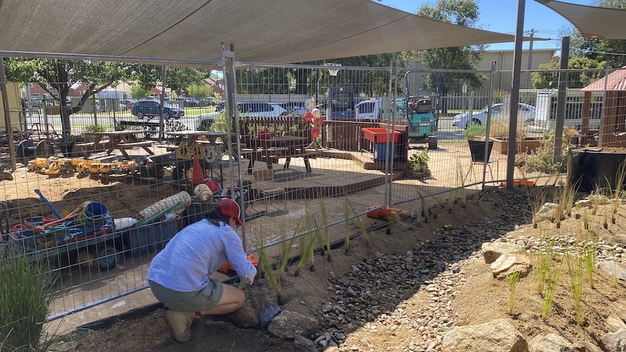The existing area was opened up to provide clear sight lines and opportunity for play and social gathering. The design promotes connection and also engages children with a generous open natural lawn and builds upon the existing shade canopies that provide the cooling of shade required for the hot summer days. A natural curvaceous rock river bed was also included in the design featuring endemic grass plants that provided a natural curious bush-style space for children to explore.